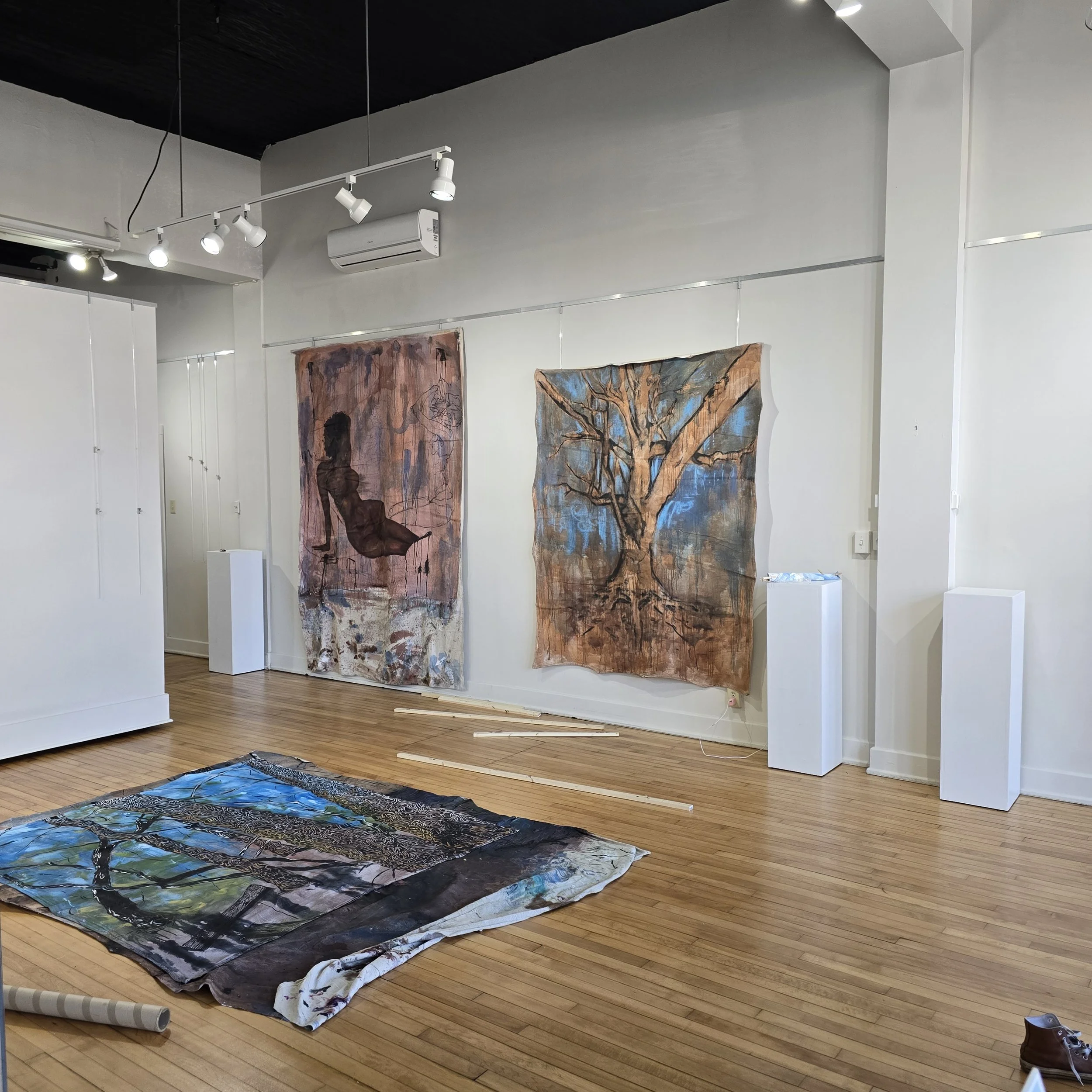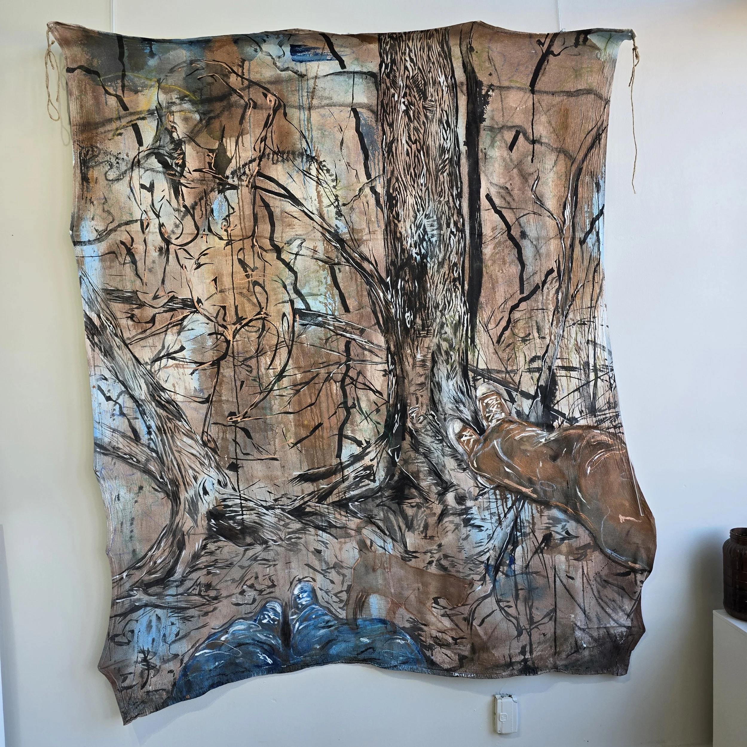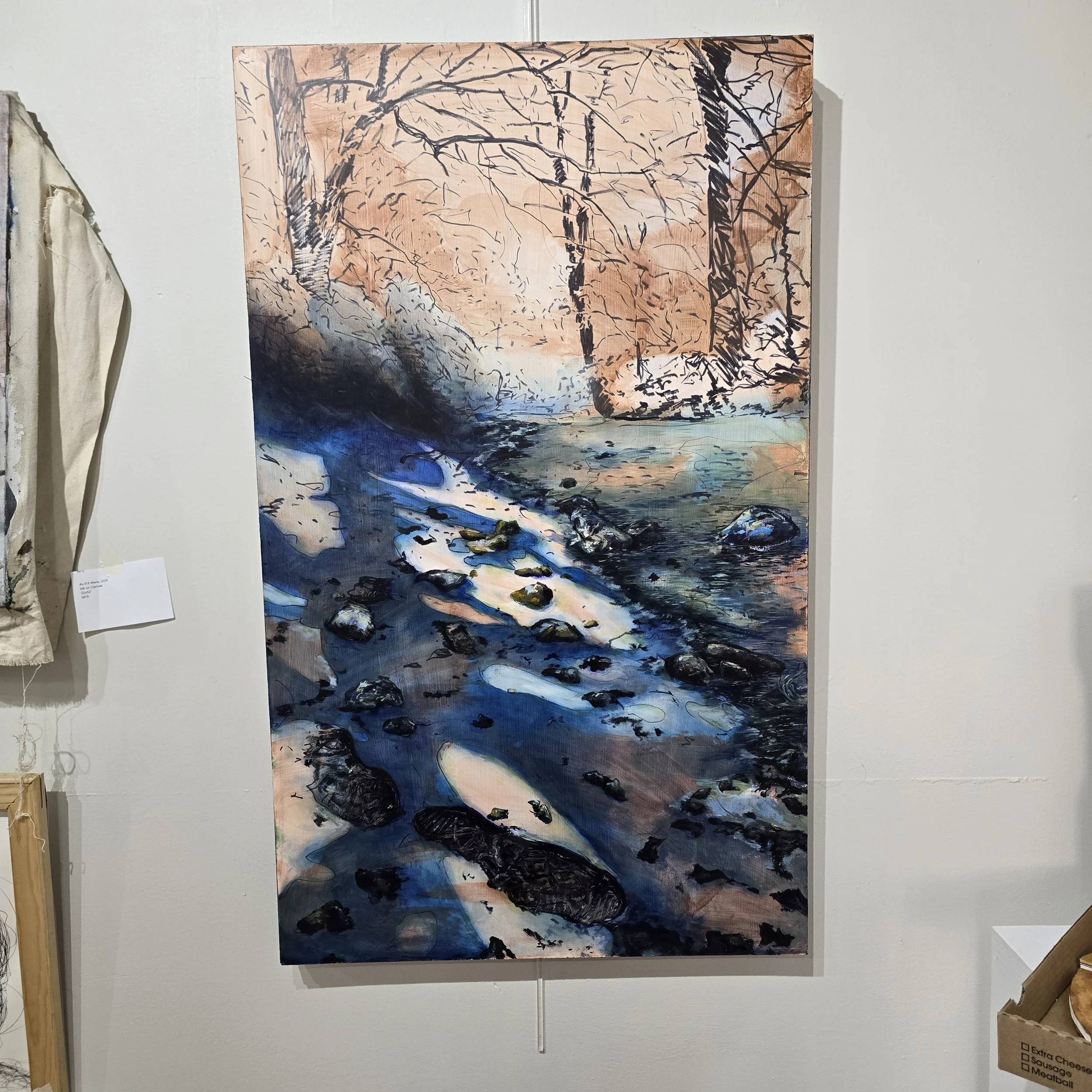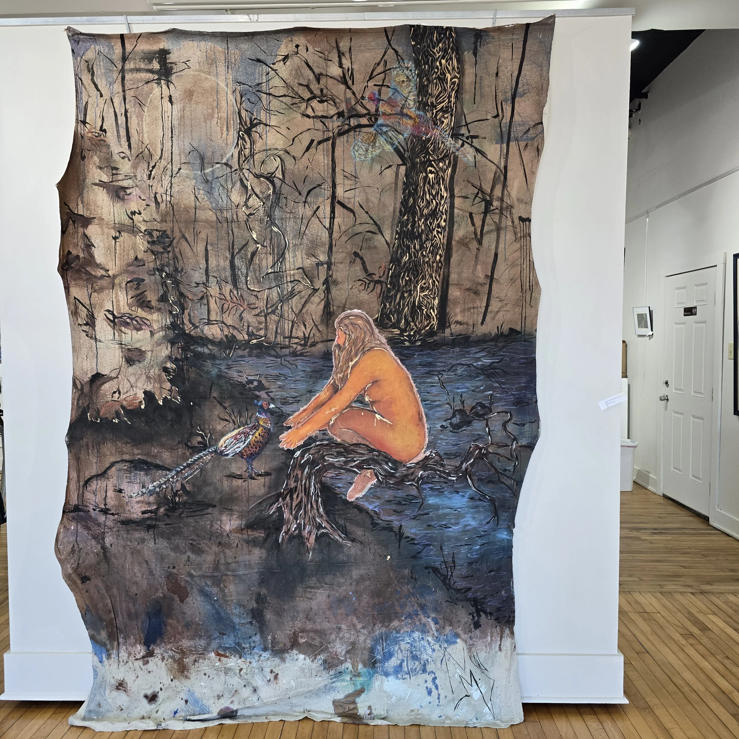 I evaluate the discarded and overlooked materials to create work that ask you to think about what is of personal value. The vulnerability of unstretched canvas distressed with layers of wash to disrupt the purity of a blank canvas, with the canvas itself being drop cloth; something intended to be stepped on and to absorb the negligent mess of those above it. Materiality influences the way we observe works, I use a large range of materials in each painting dependent on the mood I am trying to convey; charcoal alludes to being unfixed, messy, dark or shadowing, while acrylic wash is light, fast to run, permanent but malleable. The goal is to employ large vigorous body movements while working that invoke the feeling of subdued chaos and the ever-changing thoughts we have about ourselves.